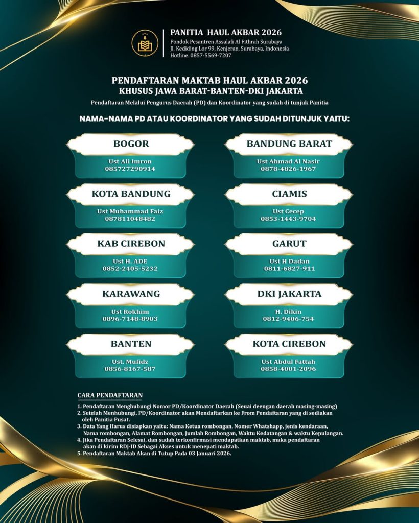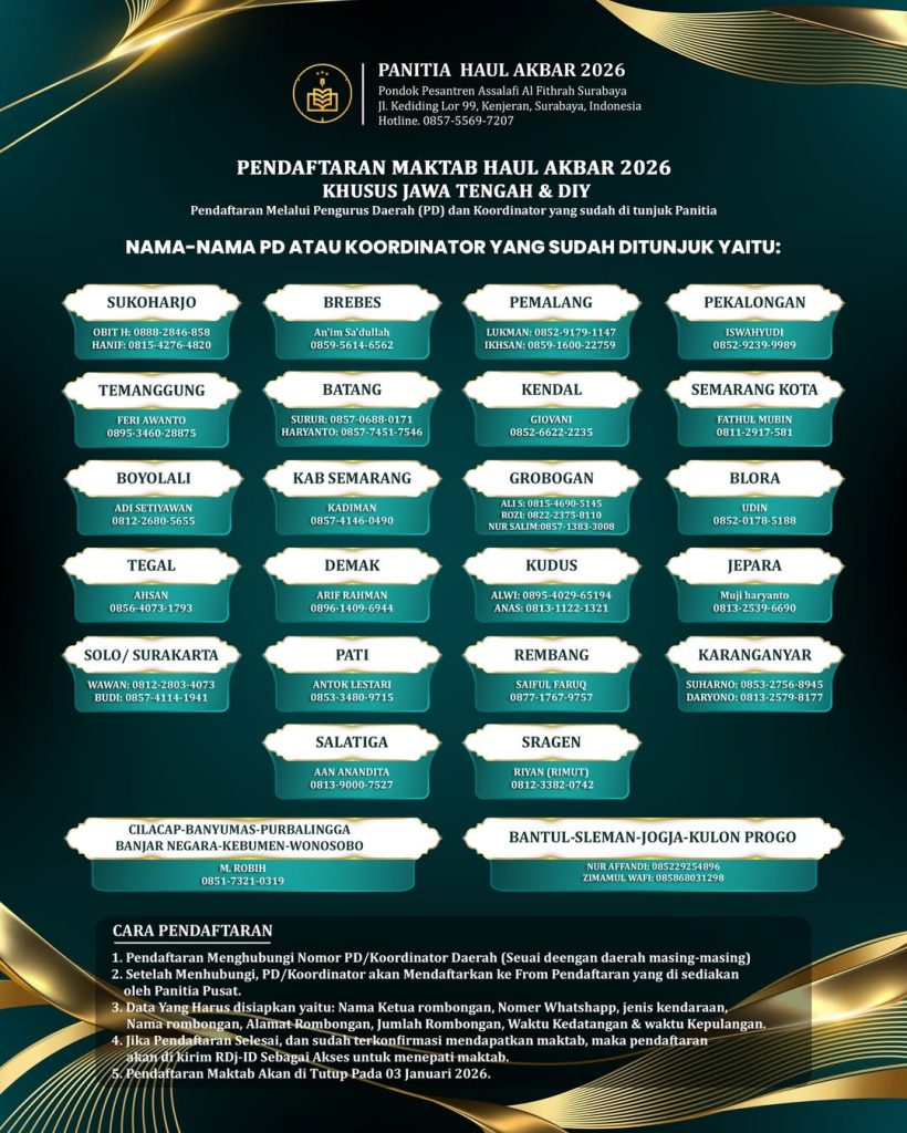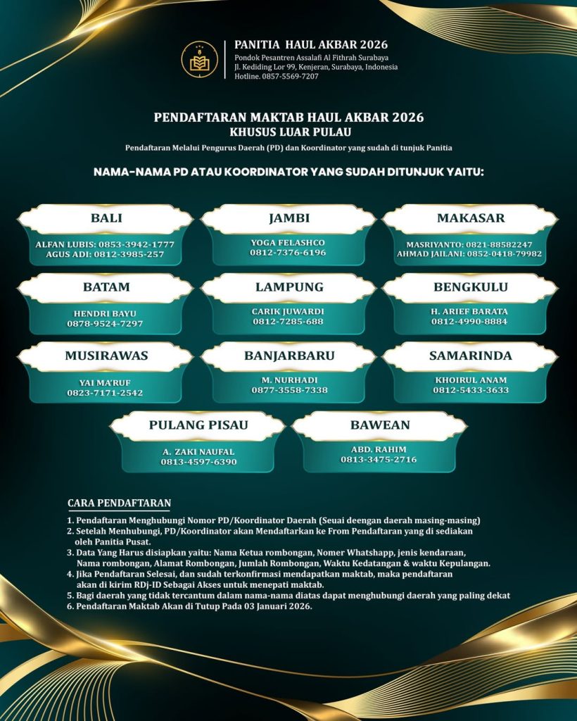 Surabaya– Dalam rangka menyukseskan Haul Akbar Pondok Pesantren Assalafi Al-Fithrah Surabaya Tahun 2026 yang akan digelar pada 24–25 Januari 2026, Tim Maktab telah memulai persiapan sejak tiga bulan sebelum puncak acara. Langkah ini dilakukan sebagai respons atas terus meningkatnya jumlah jamaah dari tahun ke tahun.